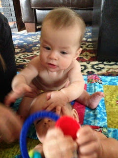 Today was a big day for poop! We left our hotel in Dayton around 9am after about five hours of sleep. I think we had at least one poopy diaper at every single stop on the way home, which in and of itself isn't a big deal except that I underestimated the number of wipes we'd need on this trip so by our last stop I had to resort to wet paper towels from the hotel bathroom. We finally made it home around five. Gotta love how six hour drives turn into eight hour drives! Anyway, we get home, bring the babies in & get the babies on the floor to stretch out.